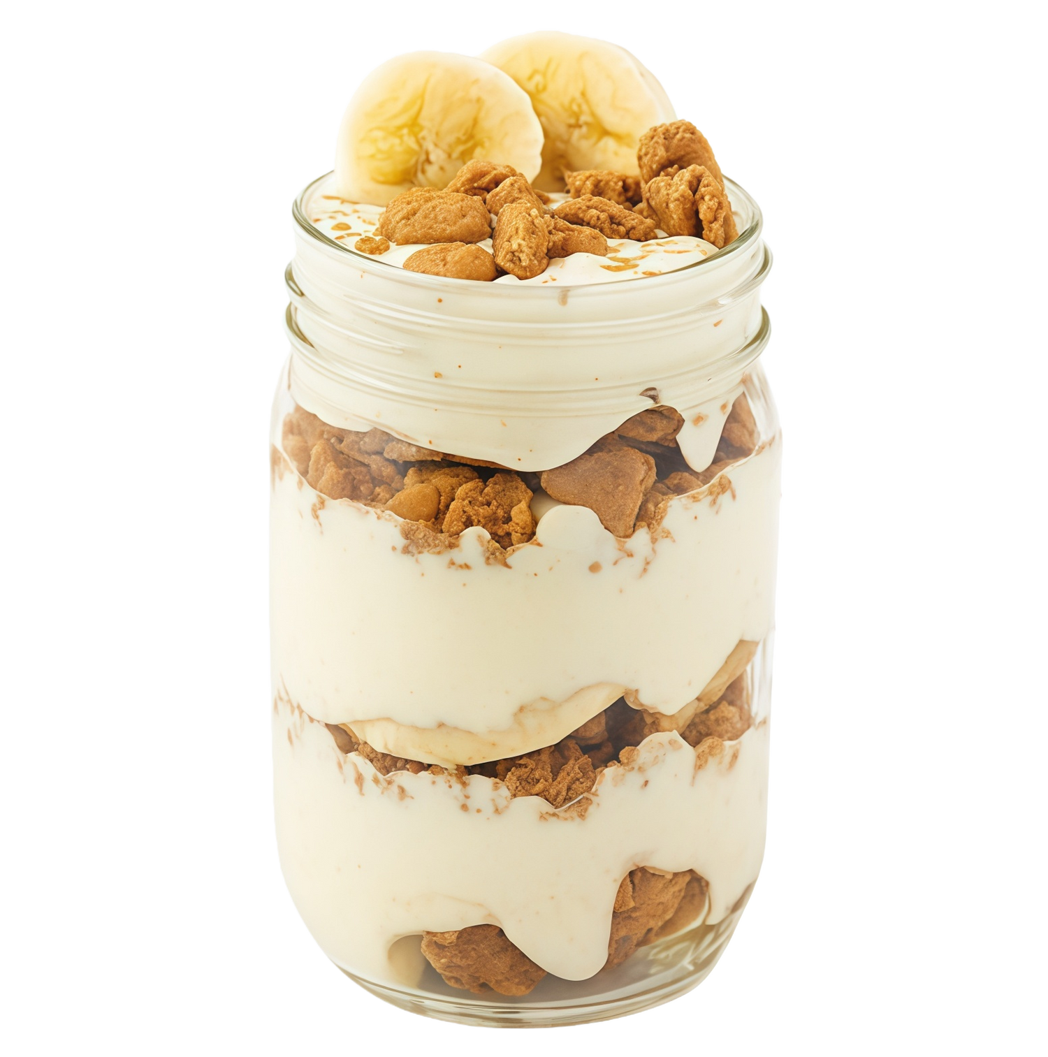 Layer ingredients into a mason jar: 1/3 Sweet Thins, 1/3 banana, and 1/3 of the yogurt protein mixture. Repeat until the jar is filled. End with a sprinkle of Sweet Thins